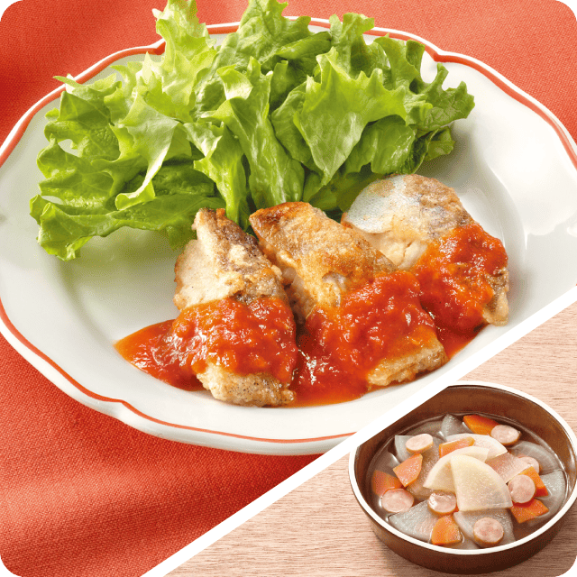 たらのムニエルトマトソース 大根とウインナーのコンソメ煮