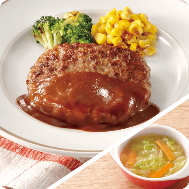 ハンバーグを袋から取り出し耐熱容器に入れ、ラップをかけて電子レンジで加熱する(2人用:3分、3人用:4分半)。
