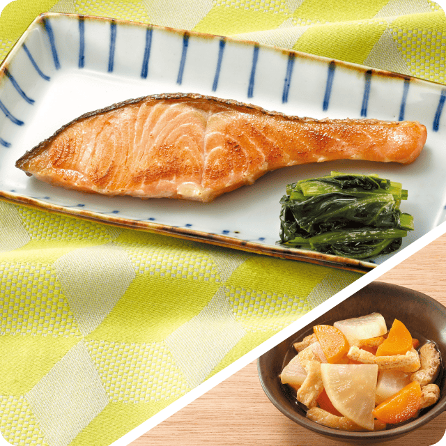 銀鮭切身をグリルで火が通るまで焼き(目安:5分)、3の器に盛る。