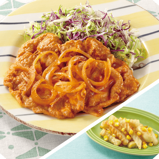 食欲そそる!ポークチャップ ポテトとコーンのバター醤油炒め