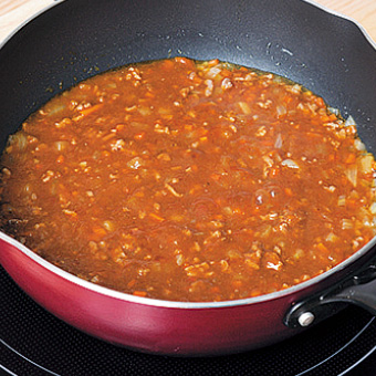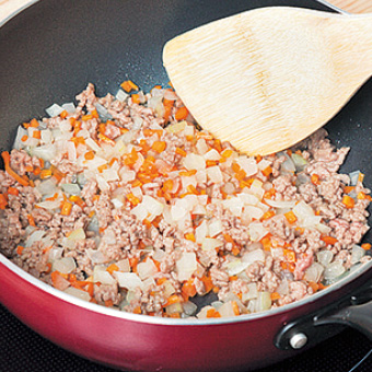 (1)鍋に油を熱して玉ねぎ・人参をよく炒め、ひき肉を入れて炒め合わせる。