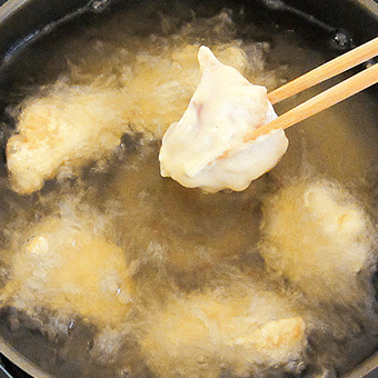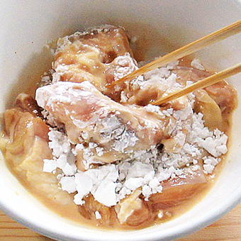 (2)鶏肉・片栗粉を混ぜ合わせ、揚げ油を中温にして揚げる。