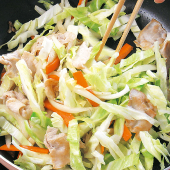 (1)フライパンに油を熱して豚肉を炒め、玉ねぎ・人参・キャベツを入れて炒め合わせる。