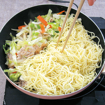 (2)(1)に焼きそば麺を入れてほぐしながら炒め、調味ベースAを加えてさらに炒める。