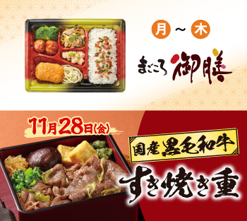 - ●11月24日週の5日間コース・7日間コースの金曜日(11月28日)のお弁当・お惣菜を「国産黒毛和牛のすき焼き重」に変更いただけます。