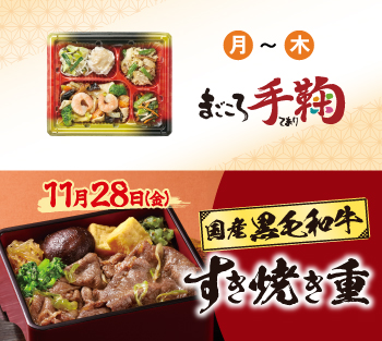 - ●11月24日週の5日間コース・7日間コースの金曜日(11月28日)のお弁当・お惣菜を「国産黒毛和牛のすき焼き重」に変更いただけます。